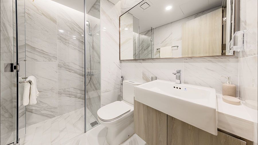 Phòng vệ sinh và nhà tắm căn hộ chung cư Masteri Era Landmark được hoàn thiện hoàn chỉnh với trần thạch cao chống ẩm, đèn downlight, hệ thống vòi nước, sen tắm, vách tắm kính, bồn cầu, lavabo và tủ lavabo đều từ các thương hiệu cao cấp hàng đầu như Duravit, Kohler, Grohe, …